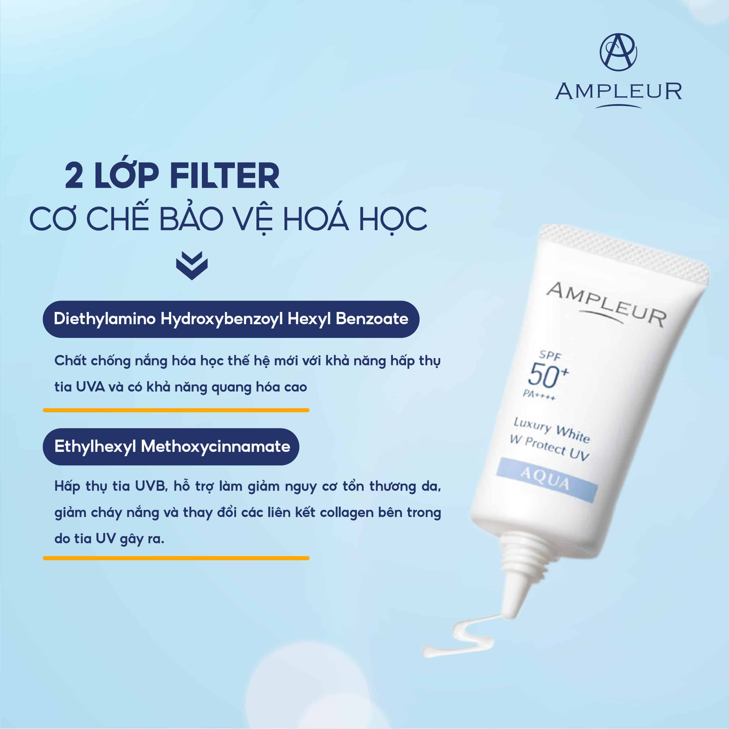 Diethylamino Hydroxybenzoyl Hexyl Benzoate: chất chống nắng hóa học thế hệ mới với khả năng hấp thụ tia UVA và có khả năng quang hóa cao; Hoạt động an toàn và ổn định với nhiệt và ánh sáng, an toàn và không ghi nhận tỉ lệ kích ứng
