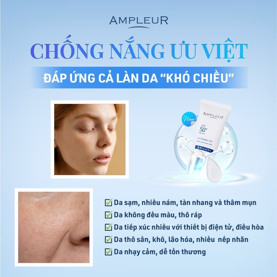 Kem chống nắng W Protect UV Bright+ SPF50+/PA++++ thích hợp cho mọi loại da, đặc biệt là da sạm nám, tàn nhang, đốm đồi mồi, thâm do mụn: