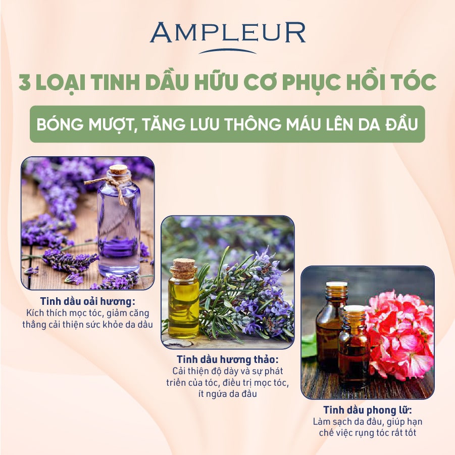 - Tinh dầu oải hương: Dầu hoa oải hương có thể tăng tốc độ phát triển của tóc. Dầu hoa oải hương có các đặc tính có thể tạo ra sự phát triển của các tế bào và giảm căng thẳng, các nhà nghiên cứu thực hiện trên động vật đã phát hiện ra rằng loại dầu này có thể tạo ra sự phát triển lông nhanh hơn; Dầu oải hương cũng có đặc tính kháng khuẩn, có thể cải thiện sức khỏe da đầu.