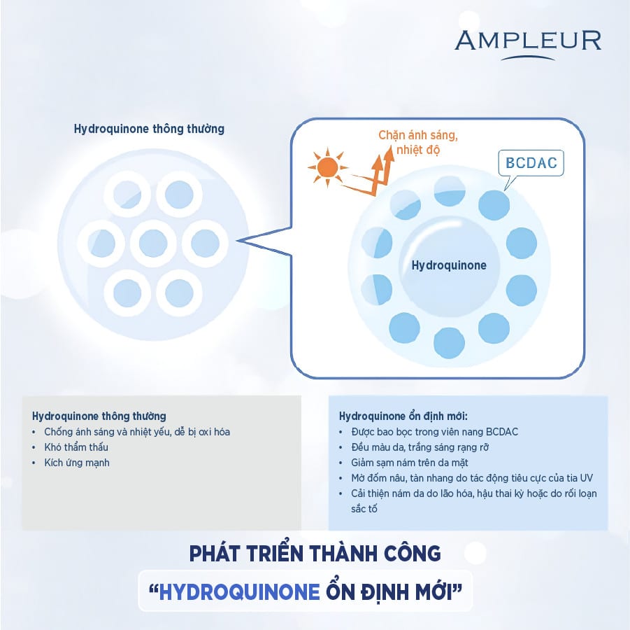 - Tuy nhiên, Hydroquinone rất khó xử lý do tính chất không ổn định của mình, vậy nên trước khi dùng cần được bác sĩ kê đơn. Vào năm 2001, Ampleur là thương hiệu mỹ phẩm đầu tiên nghiên cứu sâu về Hydroquinone. Cho ra đời Hydroquinone ổn định mới sử dụng chất này như một thành phần trong mỹ phẩm, trở thành thương hiệu đầu tiên trên thế giới phát triển sản phẩm có chứa thành phần đột phá này.
