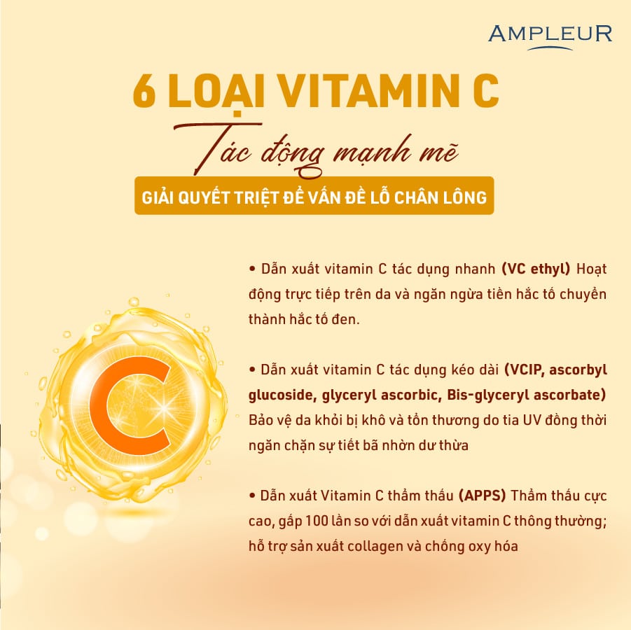 - Dẫn xuất vitamin C tác dụng kéo dài (VCIP, ascorbyl glucoside, glyceryl ascorbic, Bis-glyceryl ascorbate) Bảo vệ da khỏi bị khô và tổn thương do tia UV đồng thời ngăn chặn sự tiết bã nhờn dư thừa